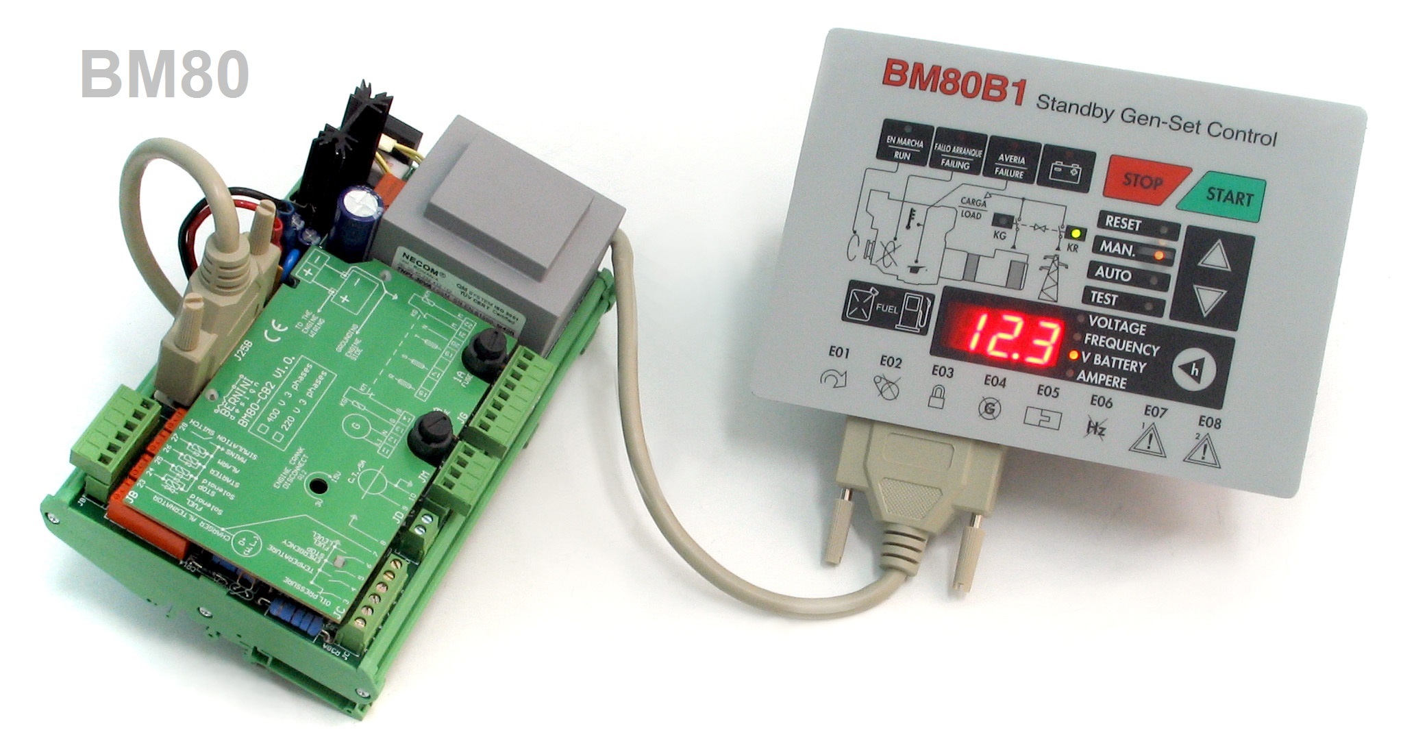 El BM80B2 es un sistema de control para grupos generadores de emergencia. El control supervisa los siguientes parámetros: Baja presión de aceite, Alta temperatura, Simulación del suministro, Parada de emergencia, Bajo nivel de combustible, Tensión del suministro (trifásico), Tensión del generador (entre fase y neutro), Corriente del generador (fase L1), Frecuencia del generador, Tensión de la batería y Alternador de carga de la batería. Además, el BM80B2 controla las siguientes salidas: Arranque, Solenoide de parada o Precalentamiento, Bocina de alarma, Solenoide de combustible, Contactores del suministro y del generador. También posee un cargador electrónico interno (12 V/1 A y 24 V/1 A) para cargar la batería del motor.