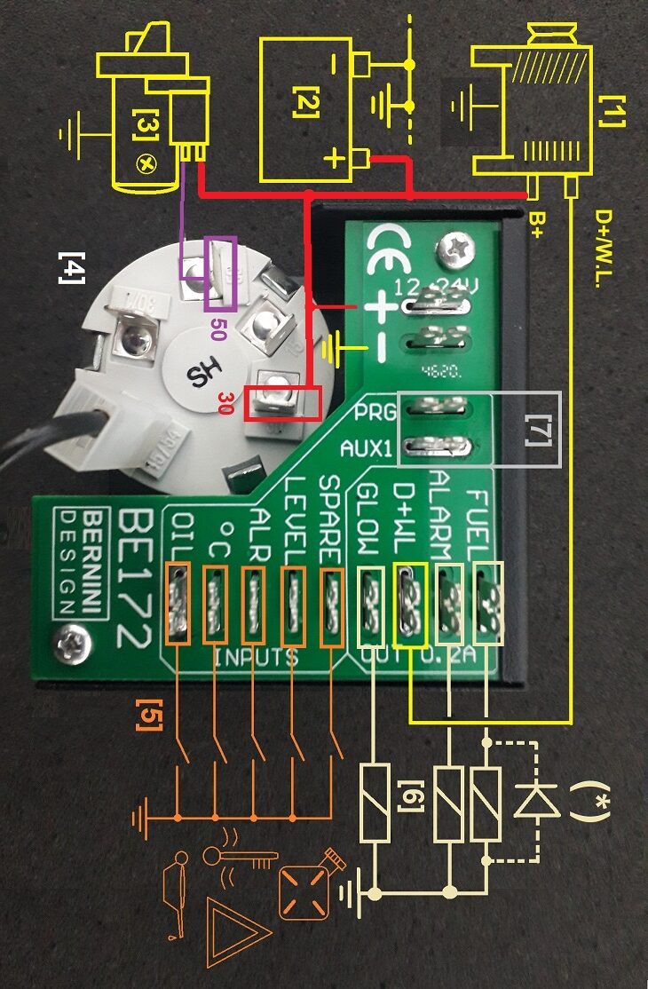 Note1 In normal conditions, when the engine is not running, the Be172 expects an oil pressure switch closed and no voltage on D+ terminals. If the Be172 finds a different logic condition, it will warn you by indicating for a few seconds the messages [oil.], [cHAr.], or both in sequence. You can anyway start the engine without problems. The Be172 reminds you to investigate the issue. It could be an open connection problem that prevents the full protection of the engine,